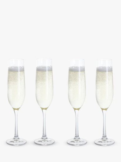 - Elegant in style and clarity, these four flutes are made from lead-free crystal glass, making them extremely durable and dishwasher safe. The long stems protect your hands from heat, so your chilled champagne, prosecco or sparkling wine doesn't get hot, and the narrow body helps retain bubbles.